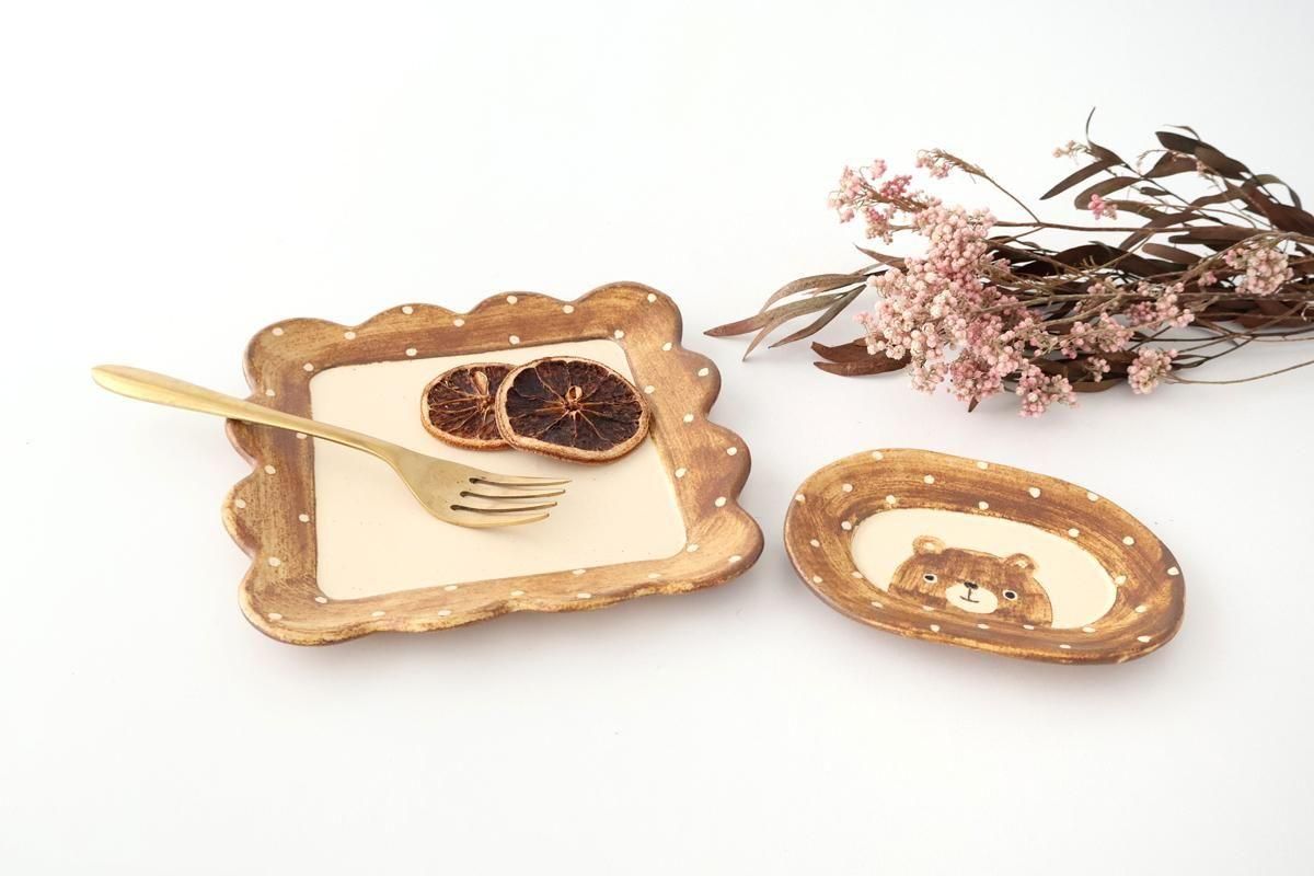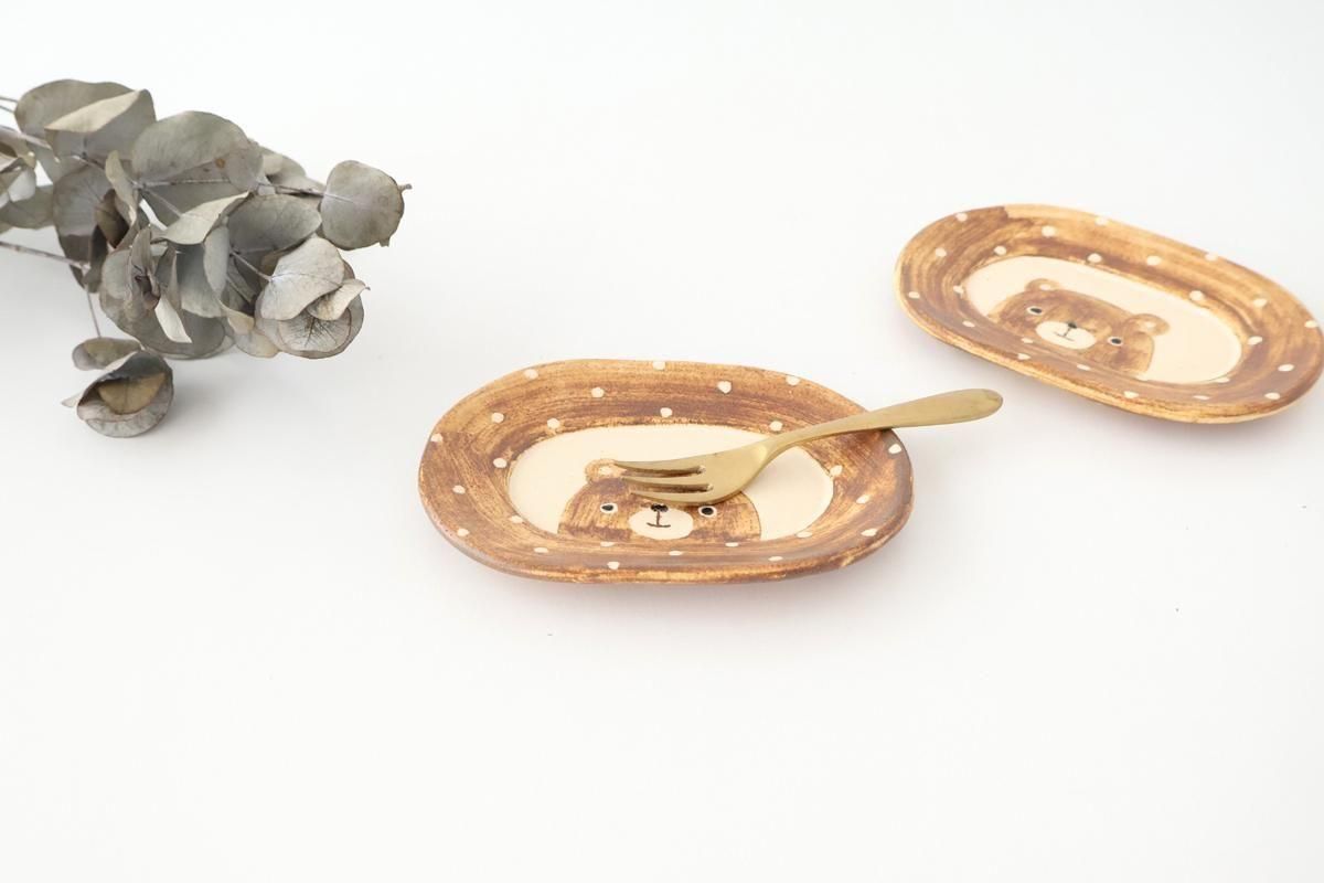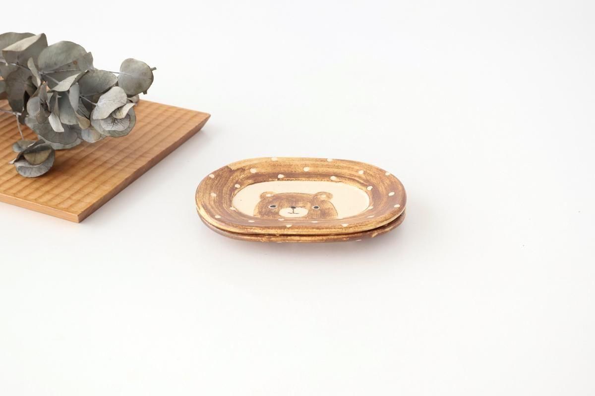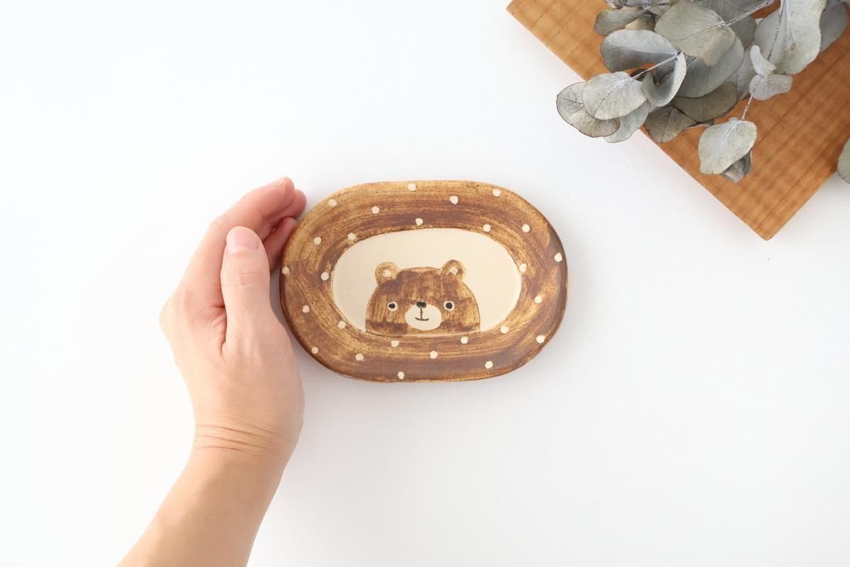 ひょっこり顔を出すクマがポイントの、楕円皿です。