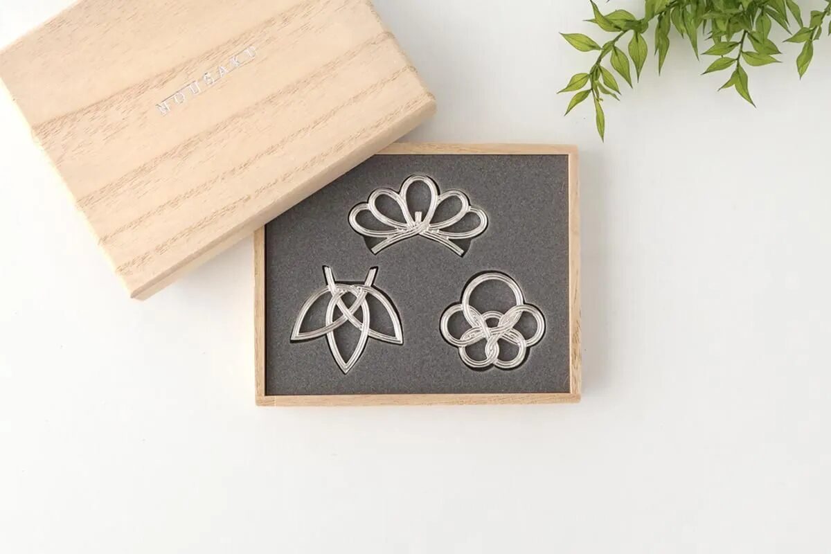 松竹梅の水引をモチーフにした、錫(すず)製の箸置きセット。