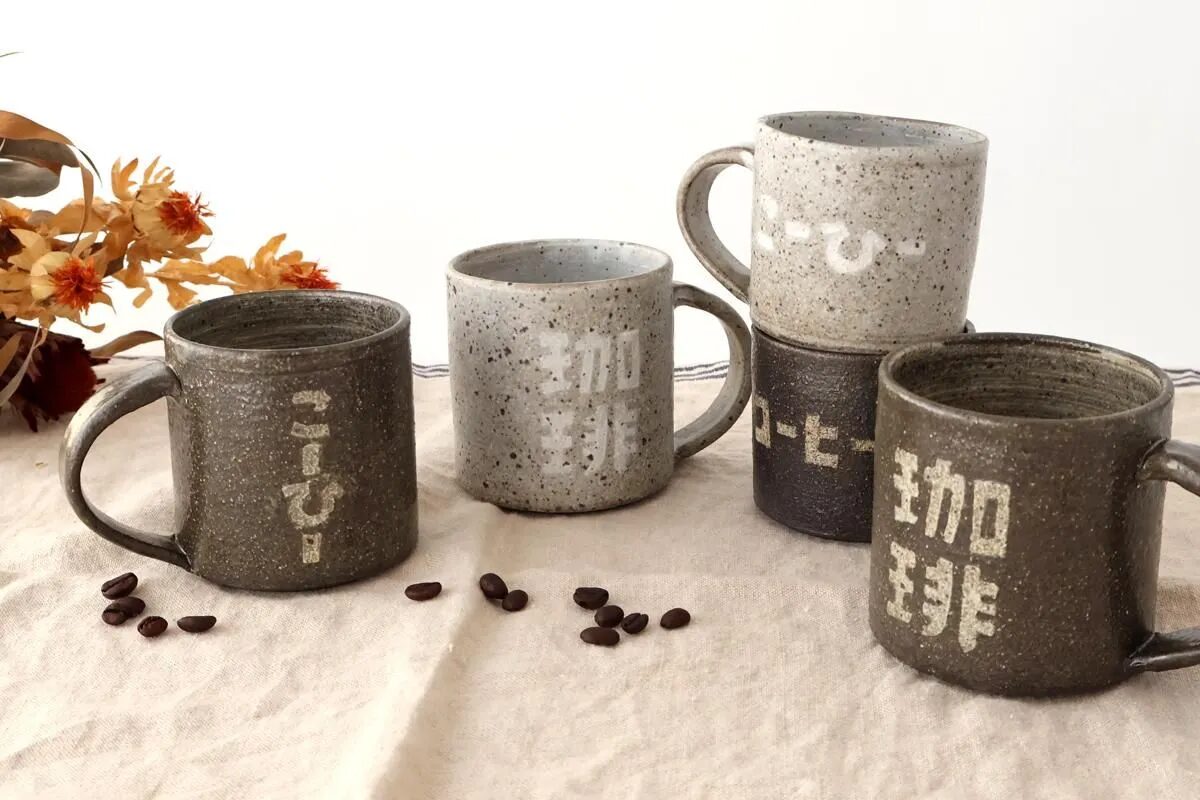 表面のロゴがなんともユニークなマグカップ。土のぬくもりと、ざらっとした質感は素朴で手仕事の味わいがあります。イベントによっては「ココア」など他の飲物のロゴのものもあり、好きなドリンクの物を選ぶのもいいですね。