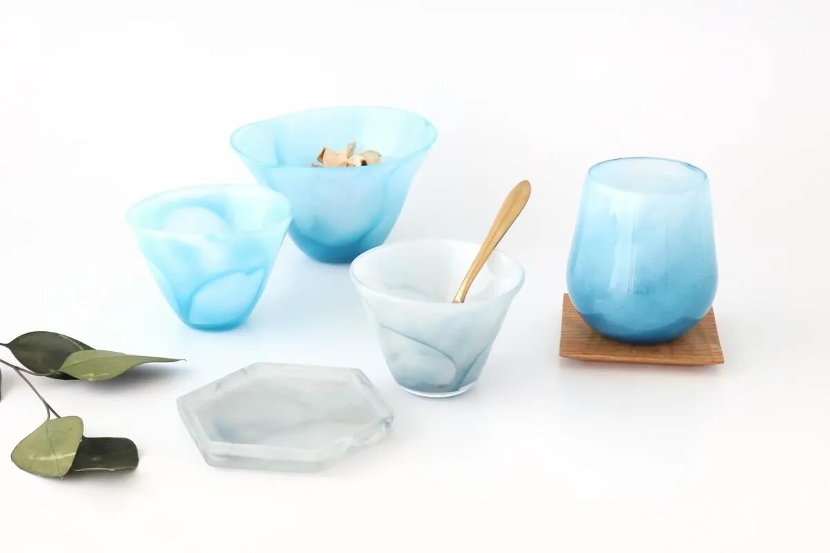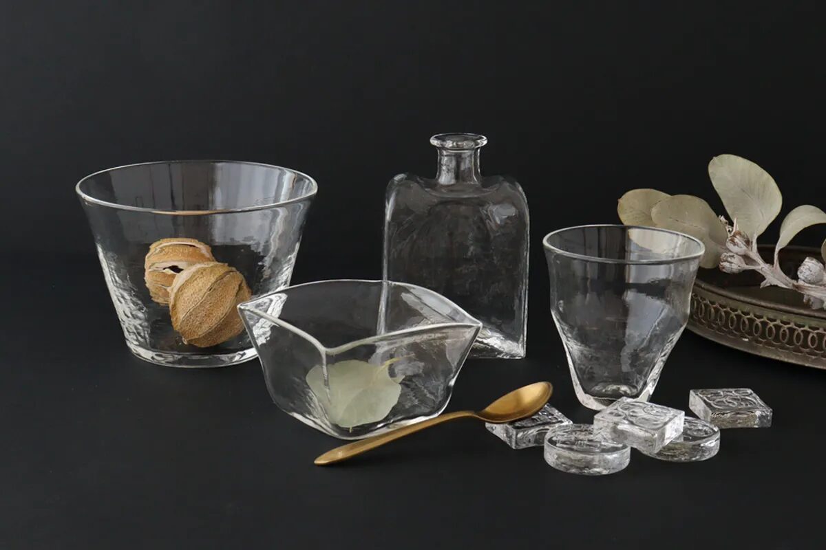 シンプルながら、手仕事ならではのゆがみや不揃いのようなフォルムが美しいガラスのうつわ。