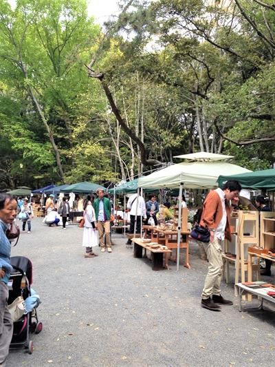 入り口をくぐっていくと、緑の生い茂る参道の両脇に作家さんのテントがずらり。