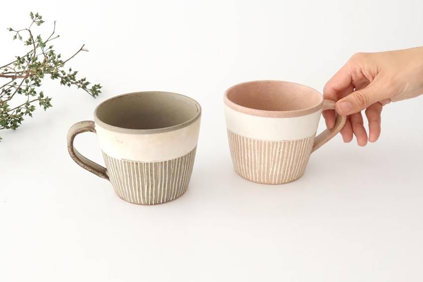 下部に縦のラインが施された、グレーとピンクのマグカップセット。