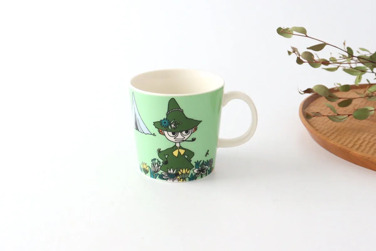 スナフキンの服装と背景がともにグリーンで統一されたマグは、食卓のアクセントになります。