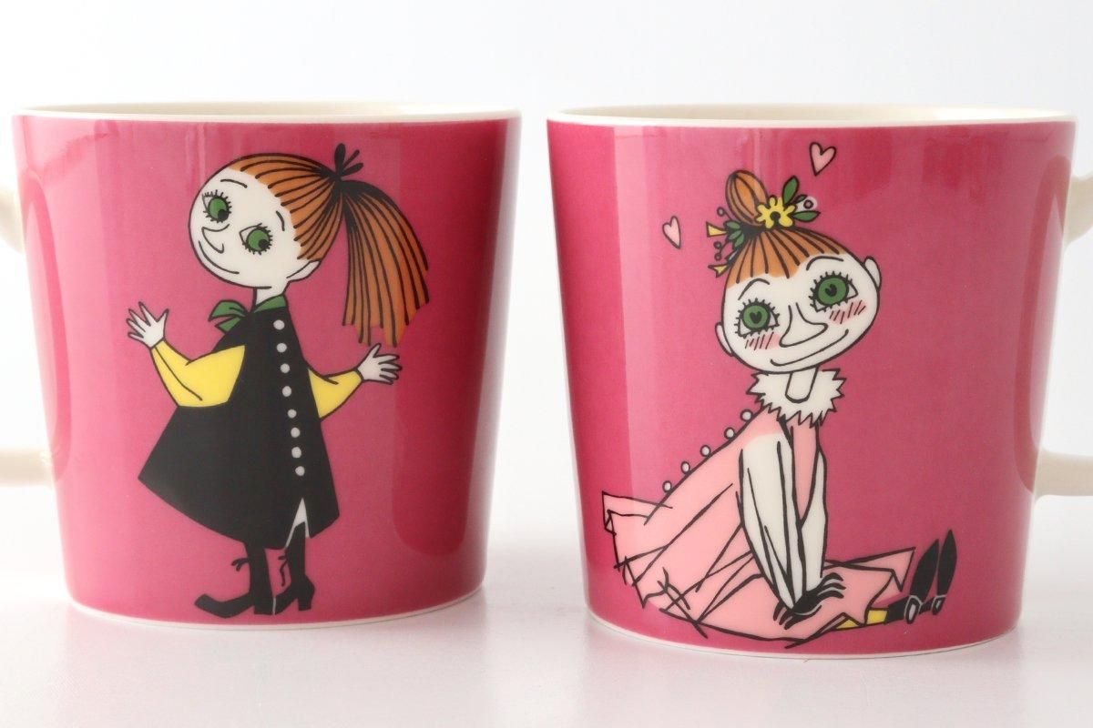 ピンクの背景にムーミンとスノークのお嬢さんが描かれたマグカップです。
