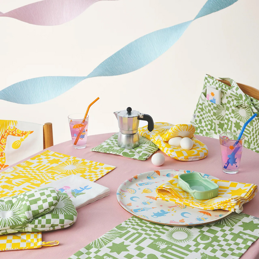 グラスに使われている、ブルーやピンクのカラーの小物とあわせることで、カラフルながらも統一感があり、幅広い世代が楽しめるテーブルになっています。