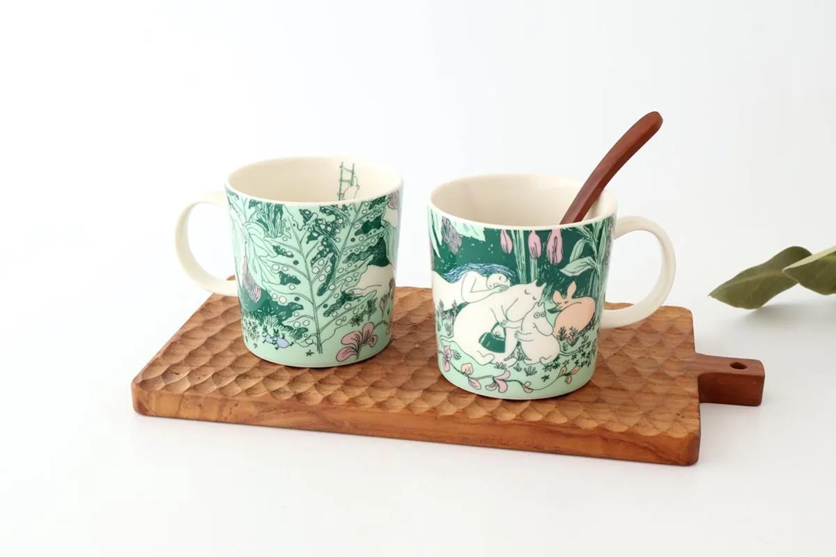全面に柄があるムーミンマグは、無地のうつわと合わせることで食卓のアクセントになります。
