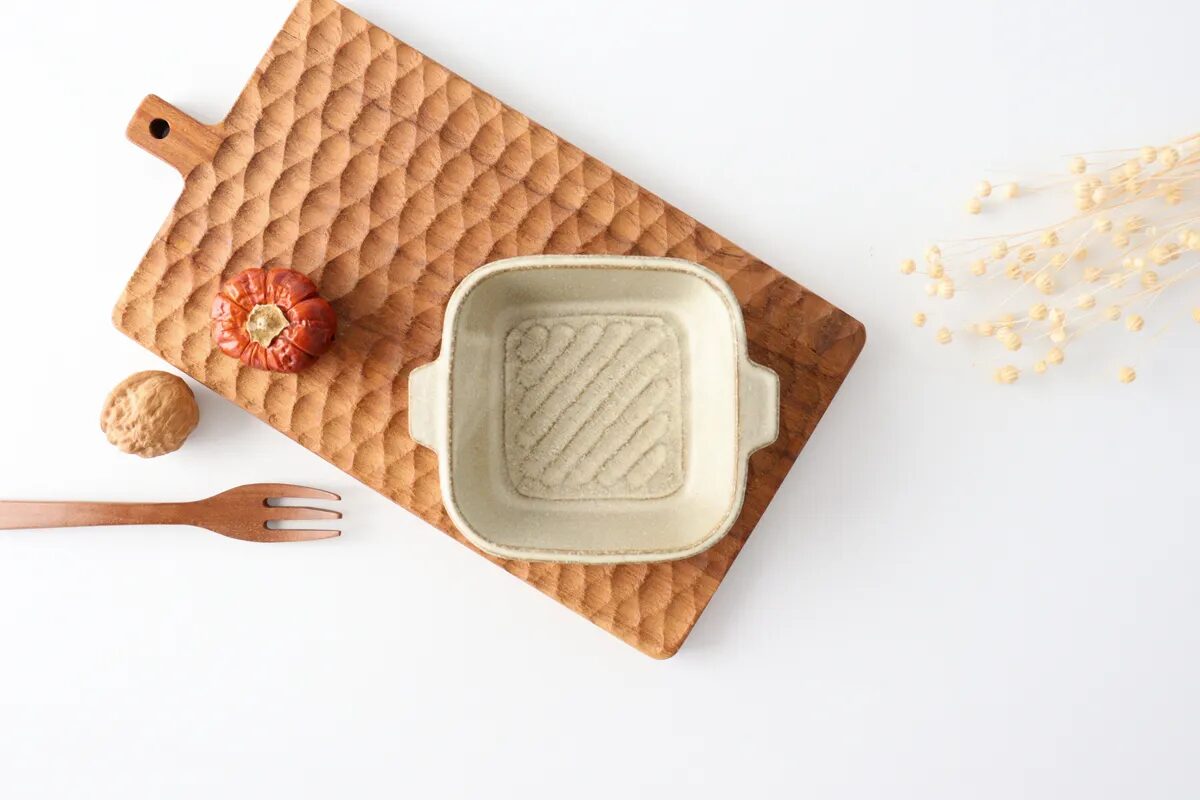両側の持ち手といいアクセントになっている、角形の耐熱皿。