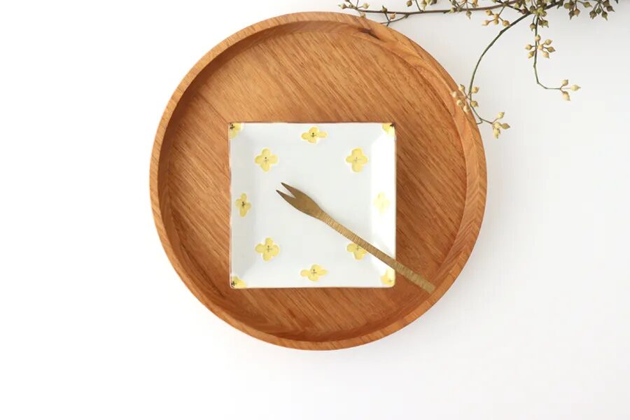 黄色い小花が散りばめられた角皿は、食卓を明るく演出します。季節を問わず使えますよ。
