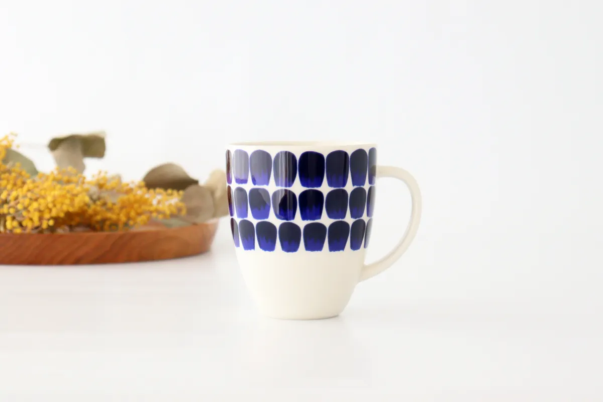 白地にブルーの点々が映えるマグカップ。