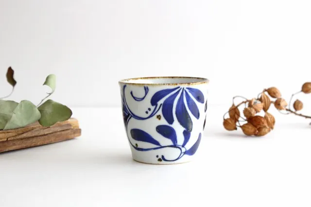 ぐるりと描かれた、藍色の葉模様が可愛らしいそば猪口です。
