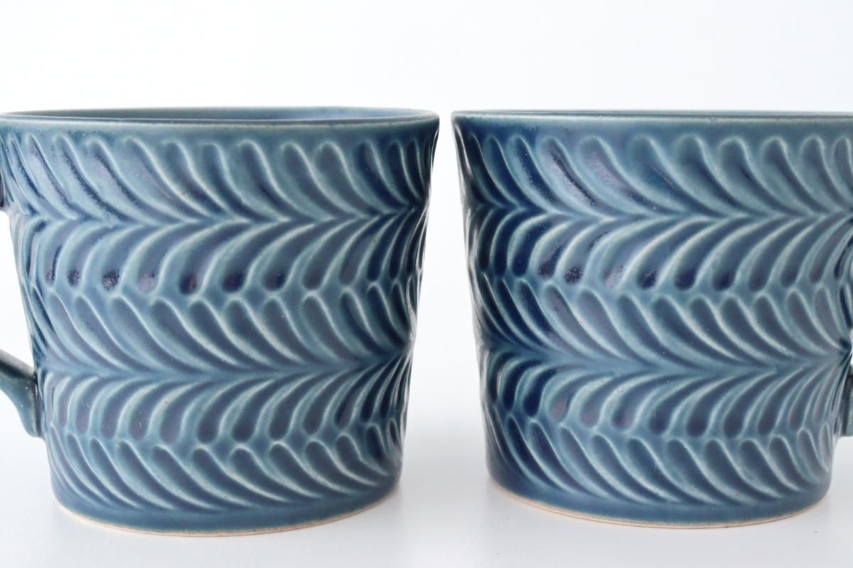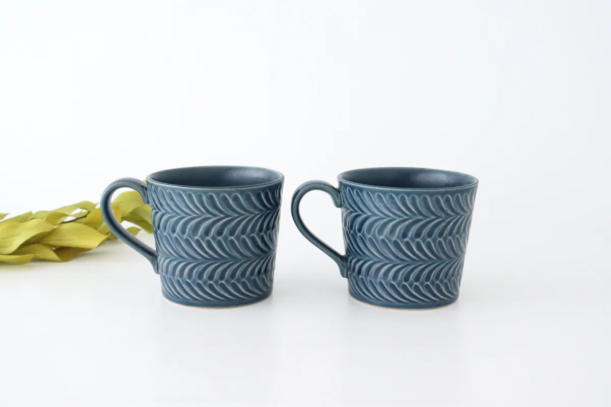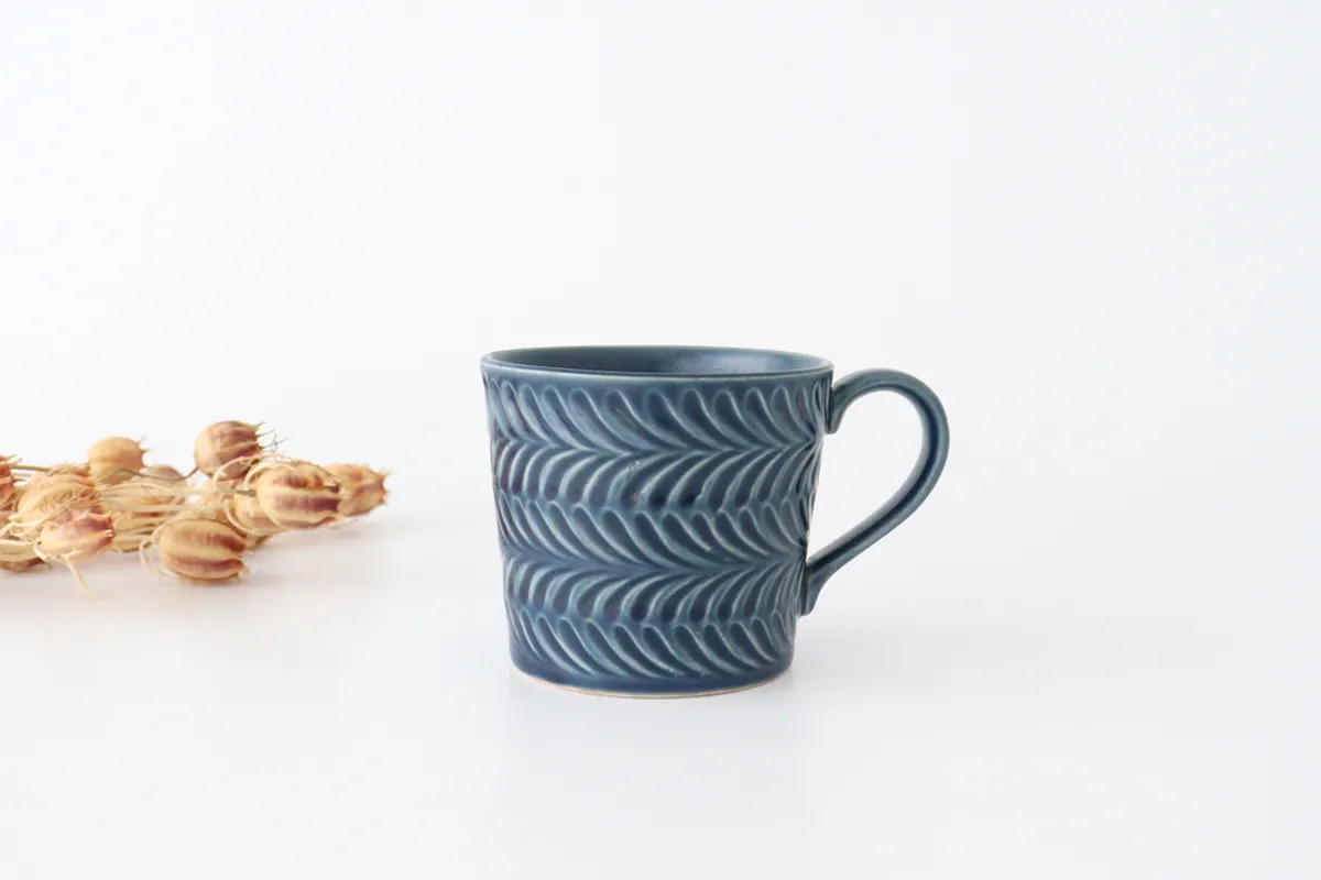 デニムカラーにモダンなレリーフが映えるマグカップ。
