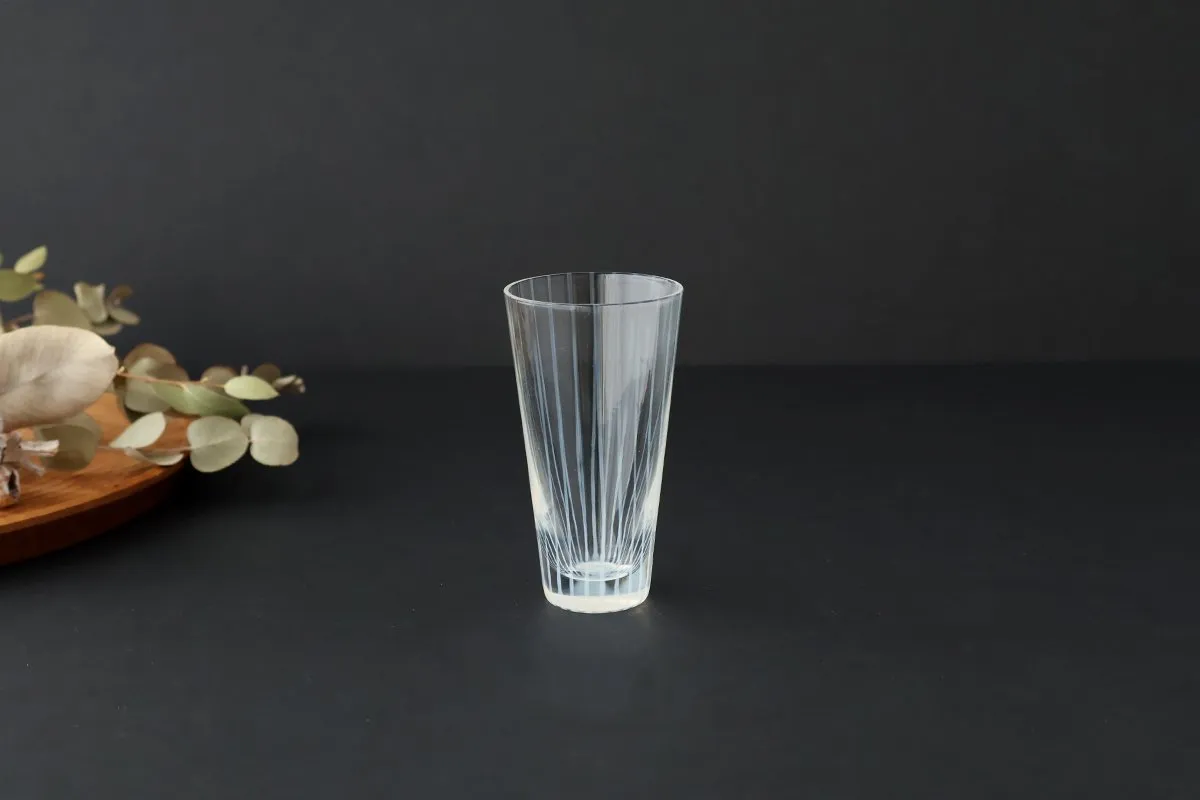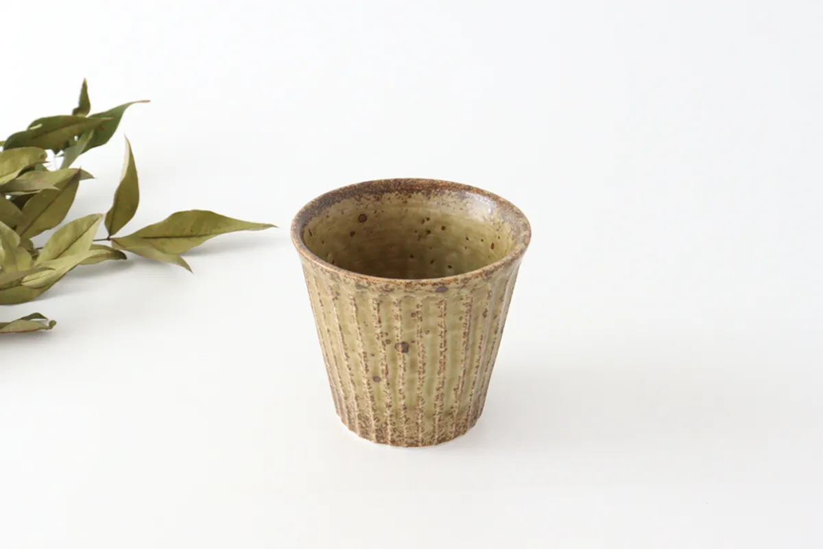 落ち着いたベージュに、縦縞のレリーフがアクセントのロックグラス。