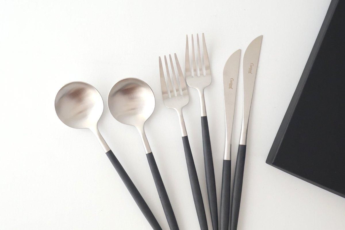 ブラック&シルバーのスタイリッシュなカトラリーは、細身のフォルムが特徴。