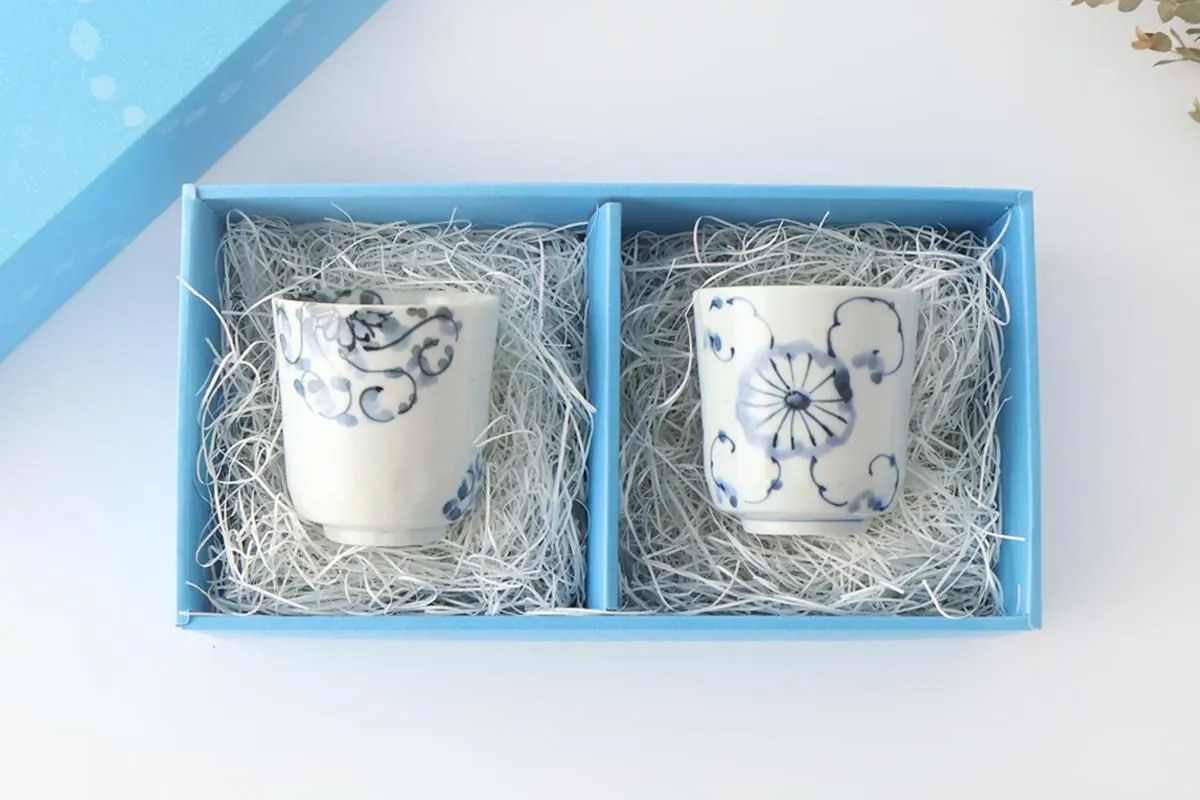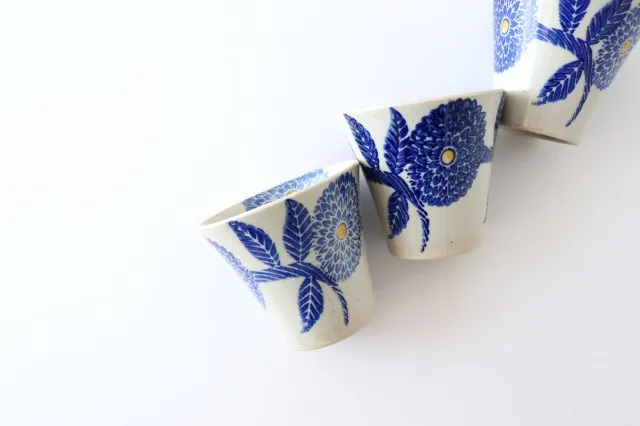菊が描かれた、上品な染付の湯呑みセットです。