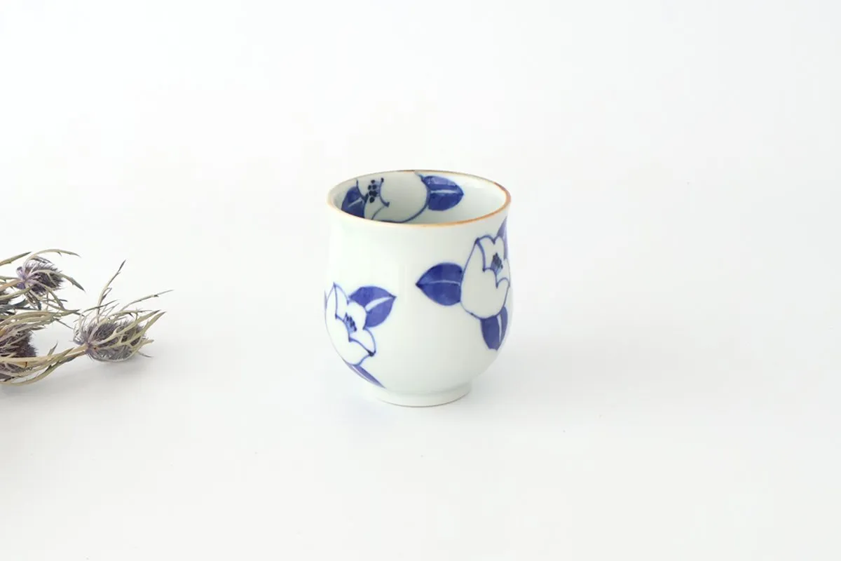 白磁にブルーで描かれた、椿の花が目を引く湯呑み。
